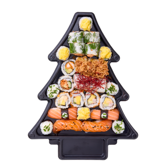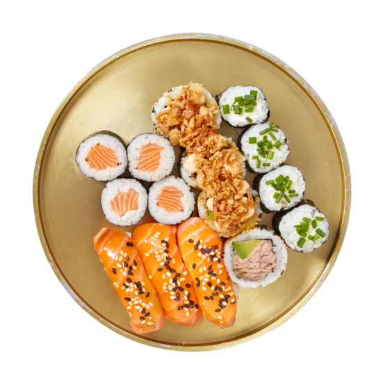 3 sushi saumon mayonnaise aromatisée à la truffe, 2 sushi saumon laqué sésame, 4 california rillettes saumon aneth, 4 california végétarien filament de piment, 4 california mangue crevette cacahuète, 4 maki avocat