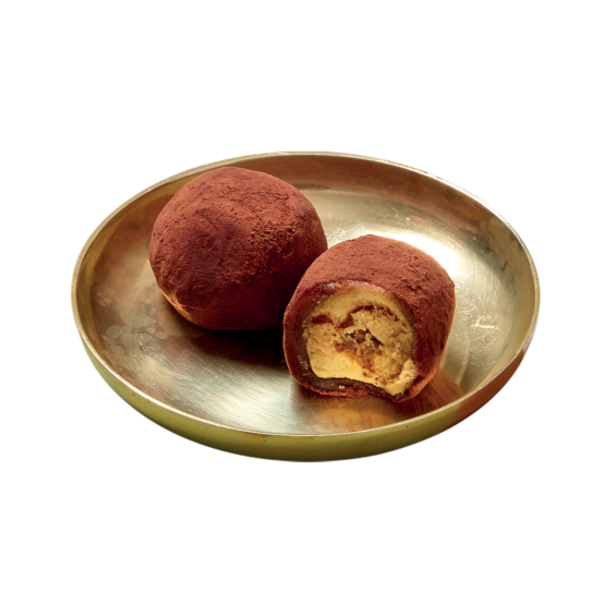 Dessert à base de pâte de riz enrobé d'une chapelure de biscuit, garniture mangue et cheesecake